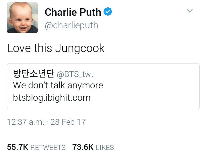 จองกุกเป็นคนที่ cover เพลงอังกฤษไว้เยอะมากค่ะ และมีเพลงนึงที่ต้นฉบับต้องออกมาชมจองกุกเพลงทีเดียวค่ะ นั้นคือเพลง We Don't Talk Anymore ของ Charlie Puth ที่ร้องร่วมกับ Selena Gomez หลังจากที่จองกุกโพสวีดิโอ cover สั้นลงทำให้ Charlie Puth ก็ได้เข้ามากด Follow Twitter ของ BTS และหลังจากจองกุกได้ปล่อย cover เวอร์ชั่นเต็มออกมา Charlie Puth ได้โพสลง Twitter ว่า Love this Jungcook ถึงแม้ว่าจะเขียนชื่อจองกุกผิด จาก Jungkook เป็น Jungcook